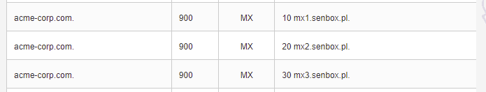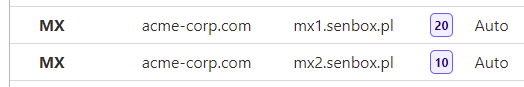 Nazwa (name): acme-corp.com. Wartość (content): mx1.senbox.pl Priorytet (Priority): 10 Typ: MX