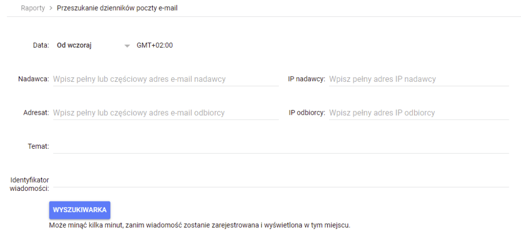 Logi znajdziemy w: Raporty > Przeszukanie dzienników poczty e-mail - Logi EmailLabs