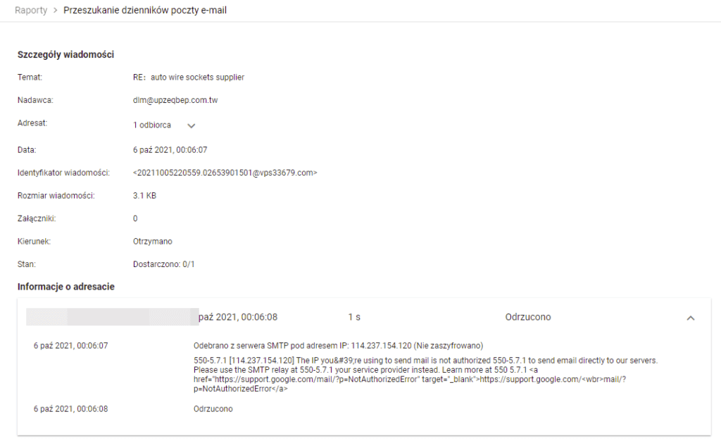 4 paź 2021, 13:09:03 Dostarczono do serwera SMTP No Error 4 paź 2021, 13:09:03 Dostarczono przez uwierzytelnioną bramę poczty wychodzącej